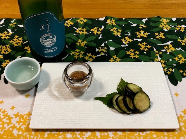 その雰囲気に合わせてイカのお刺身と自家製塩辛、友人が育てた茄子の浅漬けを